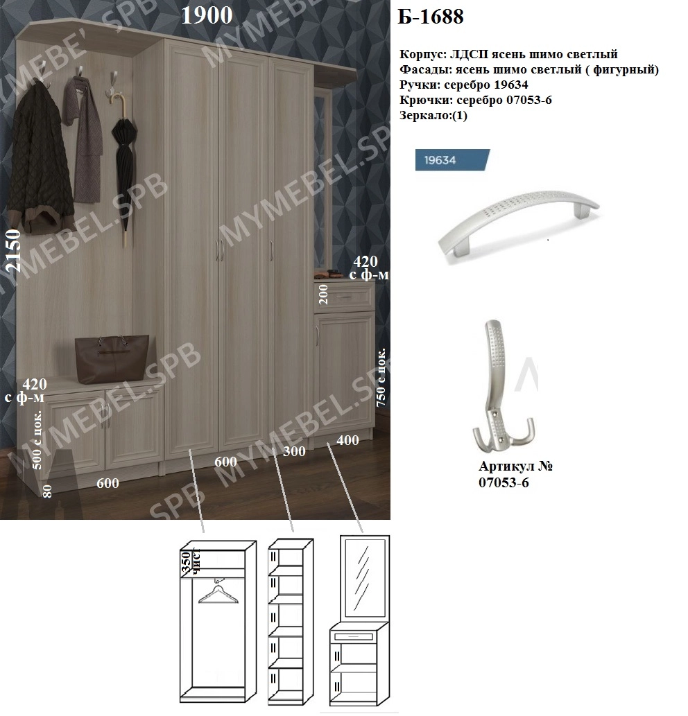 Слева щит с крючками: ш600 (3 крючка сверху на щите), снизу тумба в500 с цоколем: 2 фасада \ крыша модуля скошена по фото\